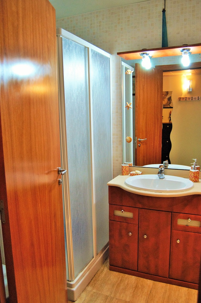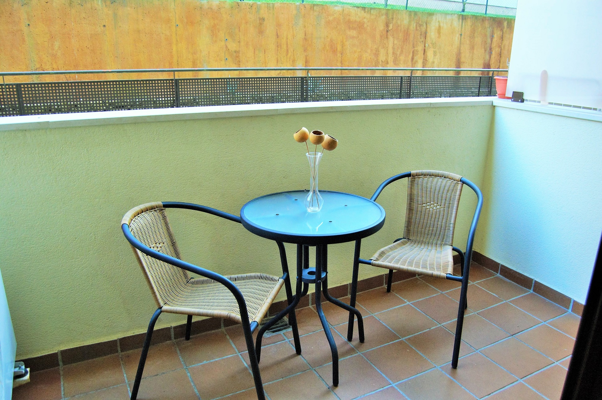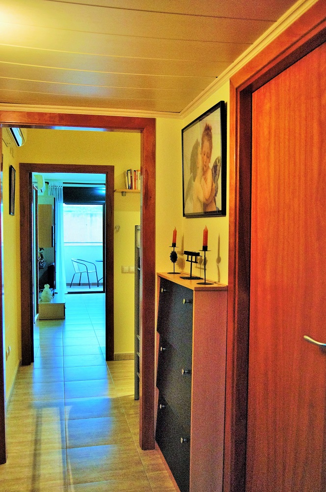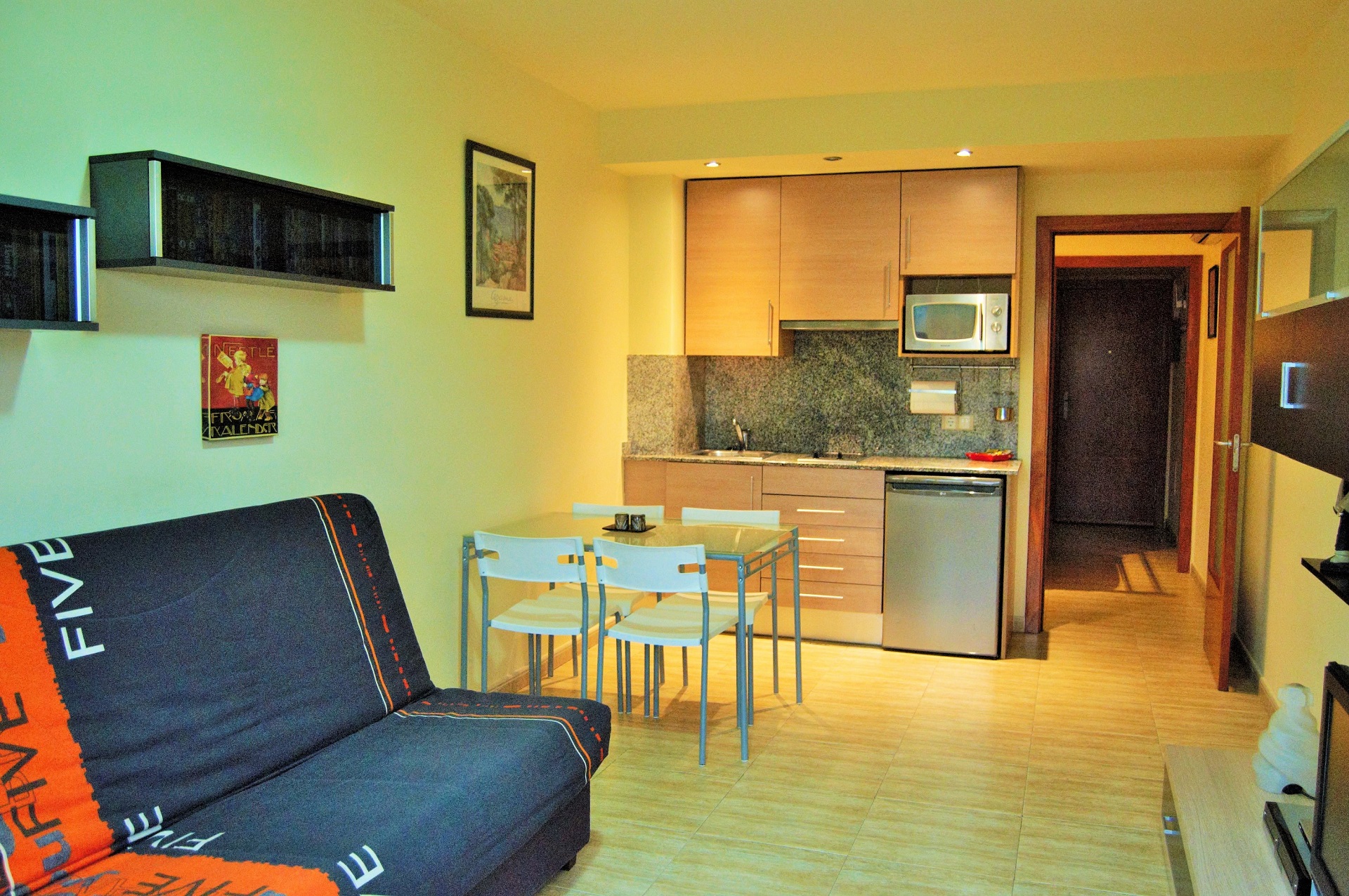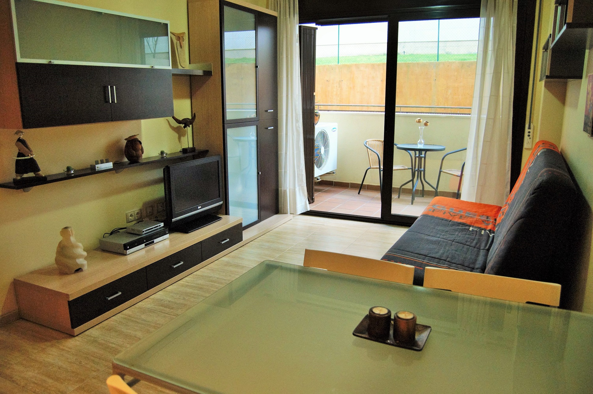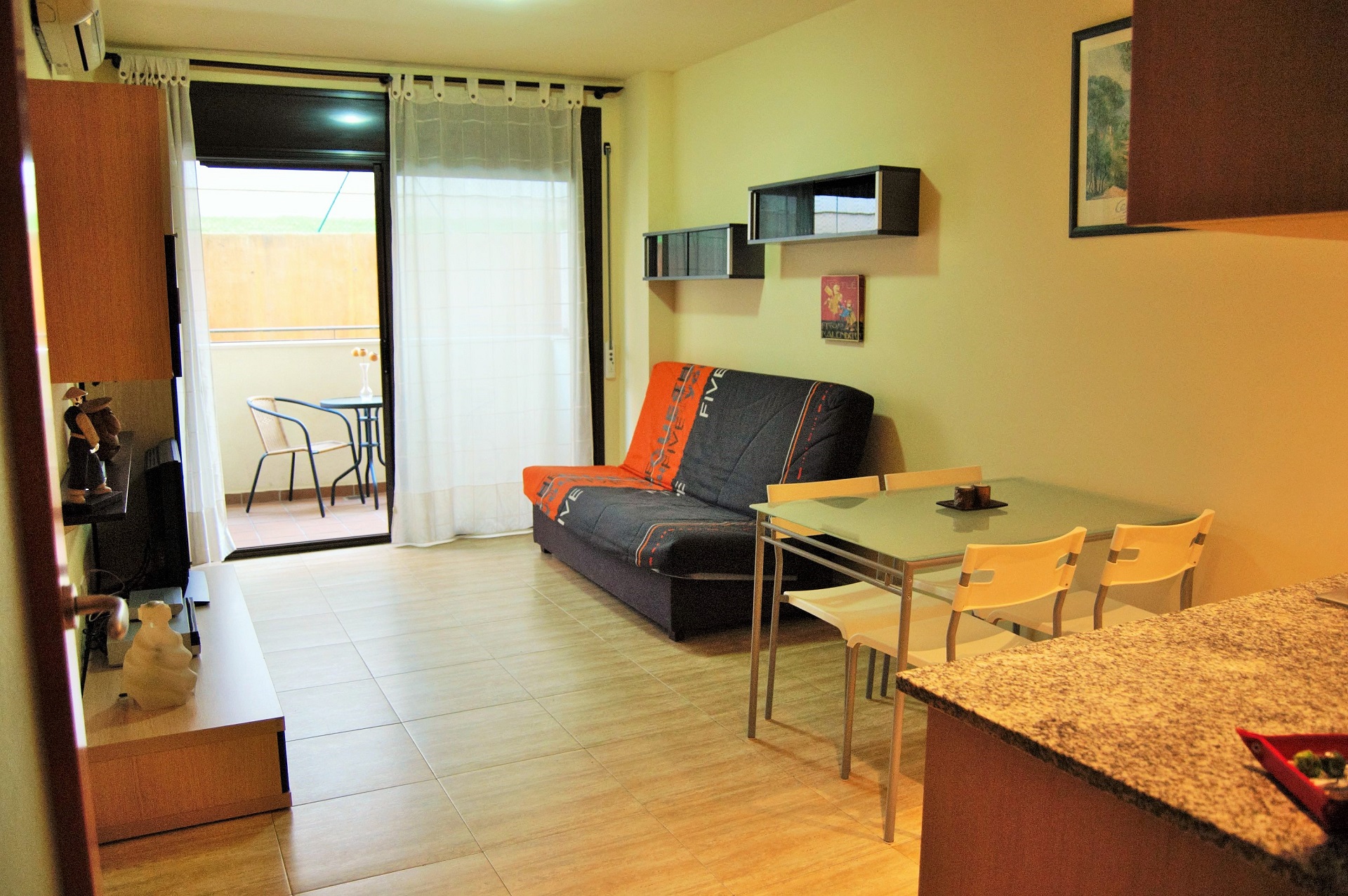 El apartamento cuenta con cocina americana, sala de estar con salida al balcón, una zona dormitorio donde hay una cama doble y una individual y baño completo, aire acondicionado. El apartamento se encuentra en la planta baja del edificio.