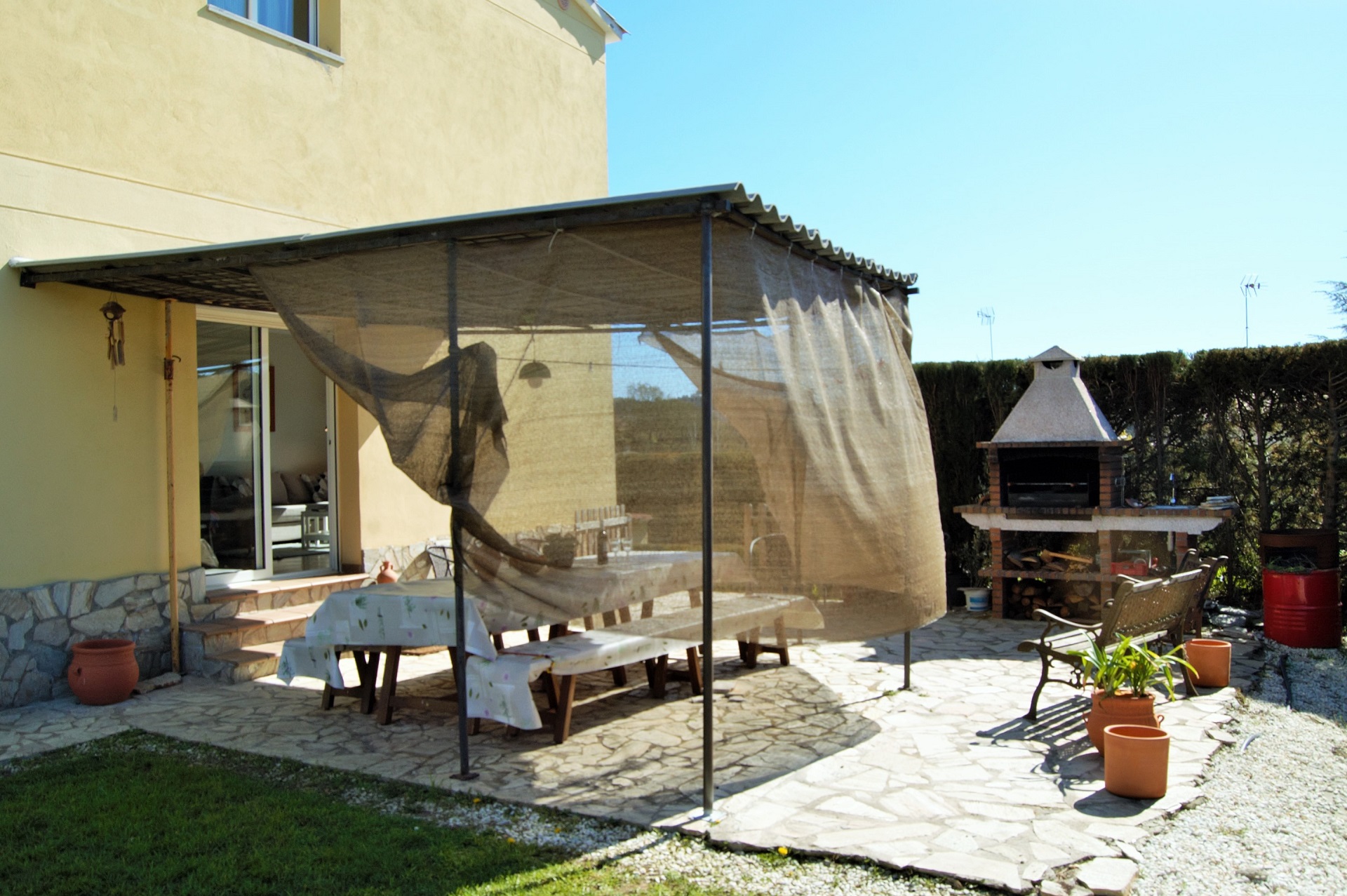 Es una casa de dos pisos. En la planta baja encontramos una sala de estar con acceso a la terraza y a la zona de barbacoa, una cocina totalmente equipada, un baño con ducha.